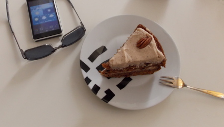 Do kawy można zamówić sobie kawałek domowego ciasta, a specjalnością Spice jest ciasto marchewkowe. Jest to najlepsze ciasto marchewkowe, jakie jadłem w życiu. Możemy je sobie też kupić na później do zjedzenia w domu. Dostaniecie wówczas gustowny ekologiczny kartonik z waszym – na pewno już – ulubionym przysmakiem. Żadnych plastikowych opakowań, jak to często bywa w znanych sieciówkach. Bowiem gdy tylko otworzycie drzwi do Spice Cafe, wszystko jest takie jak w domu, naturalne, smaczne, a ciasto marchewkowe, które piecze Isi to naprawdę creme de la creme. Niestety trudno kogoś poczęstować online ciastem, ale popatrzcie sobie chociaż jak smakowicie wygląda. To kawałek, który sobie zjadłem w domu. 😉