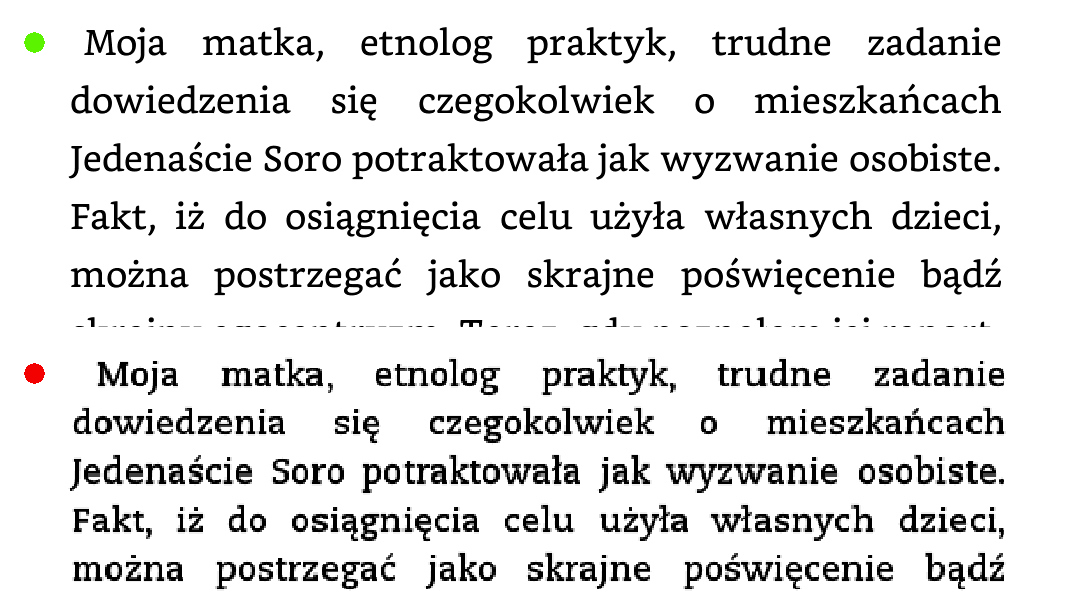 Od paru tygodniu używam nowego Kindla Paperwhite i ogólnie jestem zadowolony. Podświetlenie jest dobre, można je regulować w zależności od tego, czy czytamy w ciemniejszym lub bardziej doświetlonym pomieszczeniu. Bateria jest bardzo wytrzymała, co w wyrobach Amazonu jest dobrym standardem. A jakość ekranu jest znacznie lepsza. Poniżej na obrazku dość dobrze widać porównanie jakości nowego Paperwhite (zielona kropka) ze starym Kindle Keyboard (czerwona kropka).