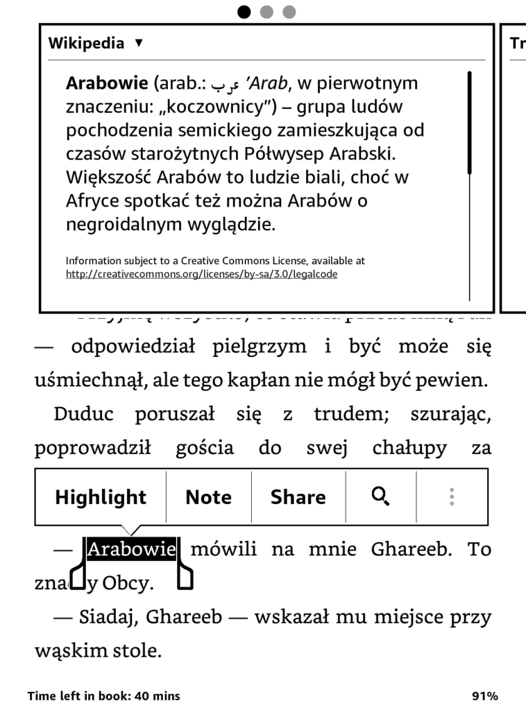 Sporą zaletą nowego Paperwhite jest to, że po zaznaczeniu automatycznie otwiera nam się okienko Wikipedii z odpowiednim hasłem, o ile dany wyraz jest hasłem Wikipedii. To się przydaje, gdy w książce pojawią się jakieś trudne terminy. Natomiast samo zaznaczanie fragmentów tekstu (highlights) jest dużo gorsze i mniej precyzyjne niż w przypadku starego Kindle. Obecnie w moich zaznaczeniach coraz częściej zdarza się jakiś dodatkowy wyraz lub dwa z sąsiedniego zdania.